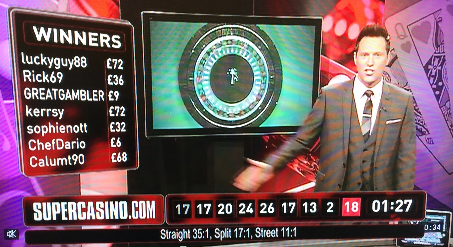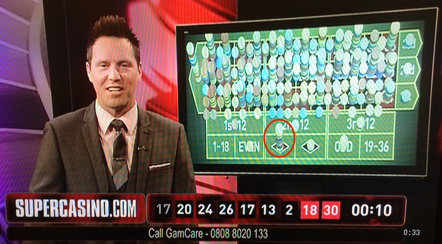 The above screenshot shows an interesting point in a sequence of games of roulette. The results of the previous nine spins are shown at the bottom of the screen in reverse order, so black 17 was the most recent.